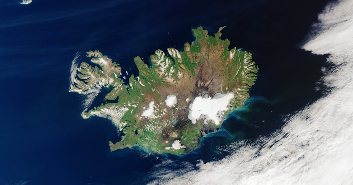 Satellite view of Iceland, map. Clouds and snow, annual rainfall
